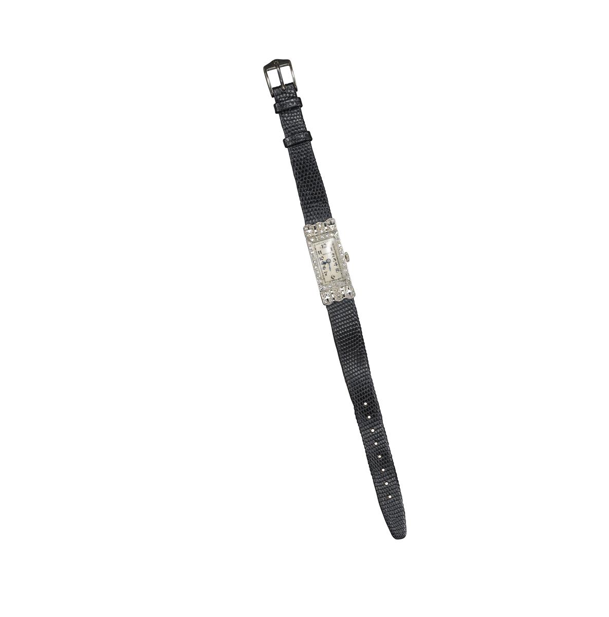 A lady's diamond wristwatch by Rolex, the signed rectangular silver dial with black Arabic numerals, the case millegrain-set with diamonds and diamond-set scallop-edged lugs, manual movement, the case back inscribed A.R 27 Nov 1935, 1.5cm wide, with later leather strap