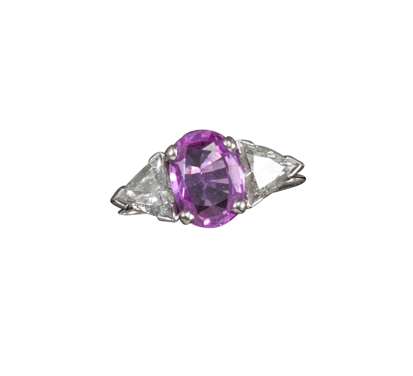 A pink sapphire and diamond-set three-stone ring, the oval-shaped pink sapphire set with two triangular-cut shoulder diamonds in 18ct white gold, size M