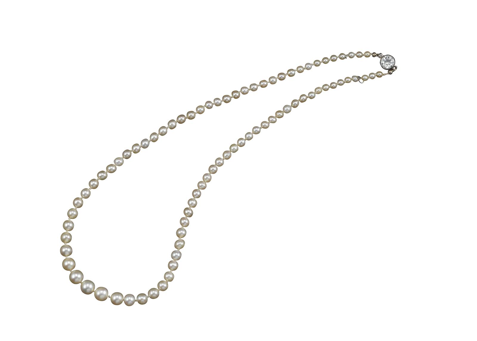 A single-row pearl necklace, the pearls graduate from 3.17-7.09mm, the clasp millegrain-set with an old circular-cut diamond in platinum, diamond weighs approximately 0.85cts, necklace 44cm long
