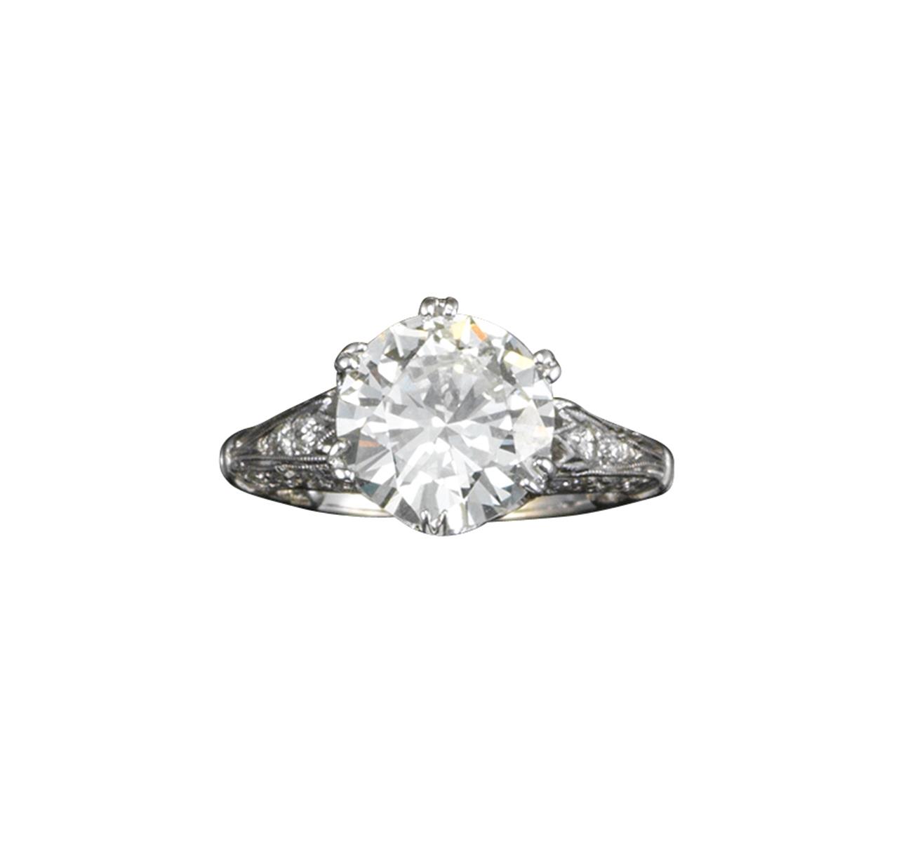 A diamond solitaire ring, the round brilliant-cut diamond weighs approximately 2.75cts and millegrain-set in white gold with small circular-cut diamonds to the shoulders and crown, size H (with inner re-sizing balls)