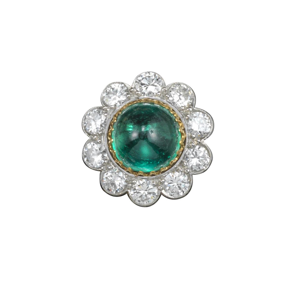 Accompanied by report number 5777-9072 dated 6th March 2017 from GCS, London stating that the cabochon emerald weighs approximately 8.55cts and is a natural emerald with indications of minor clarity enhancement, origin: Colombia