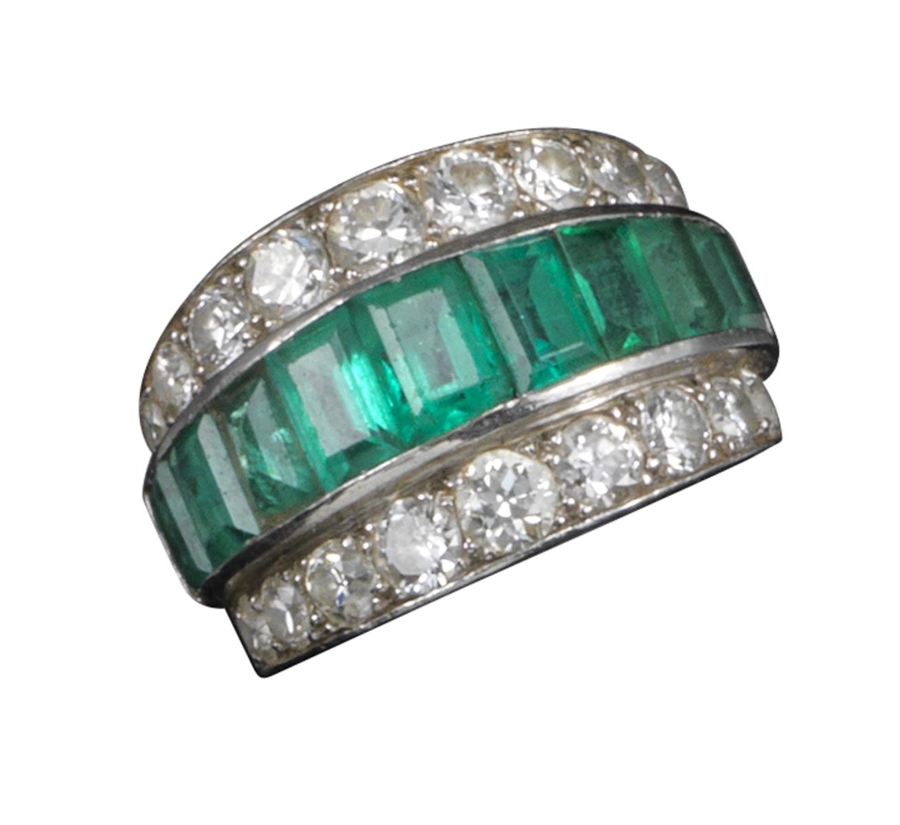 An Art Deco emerald and diamond cocktail ring, set with a central line of emerald-cut emeralds within borders of circular-cut diamonds in platinum, size M