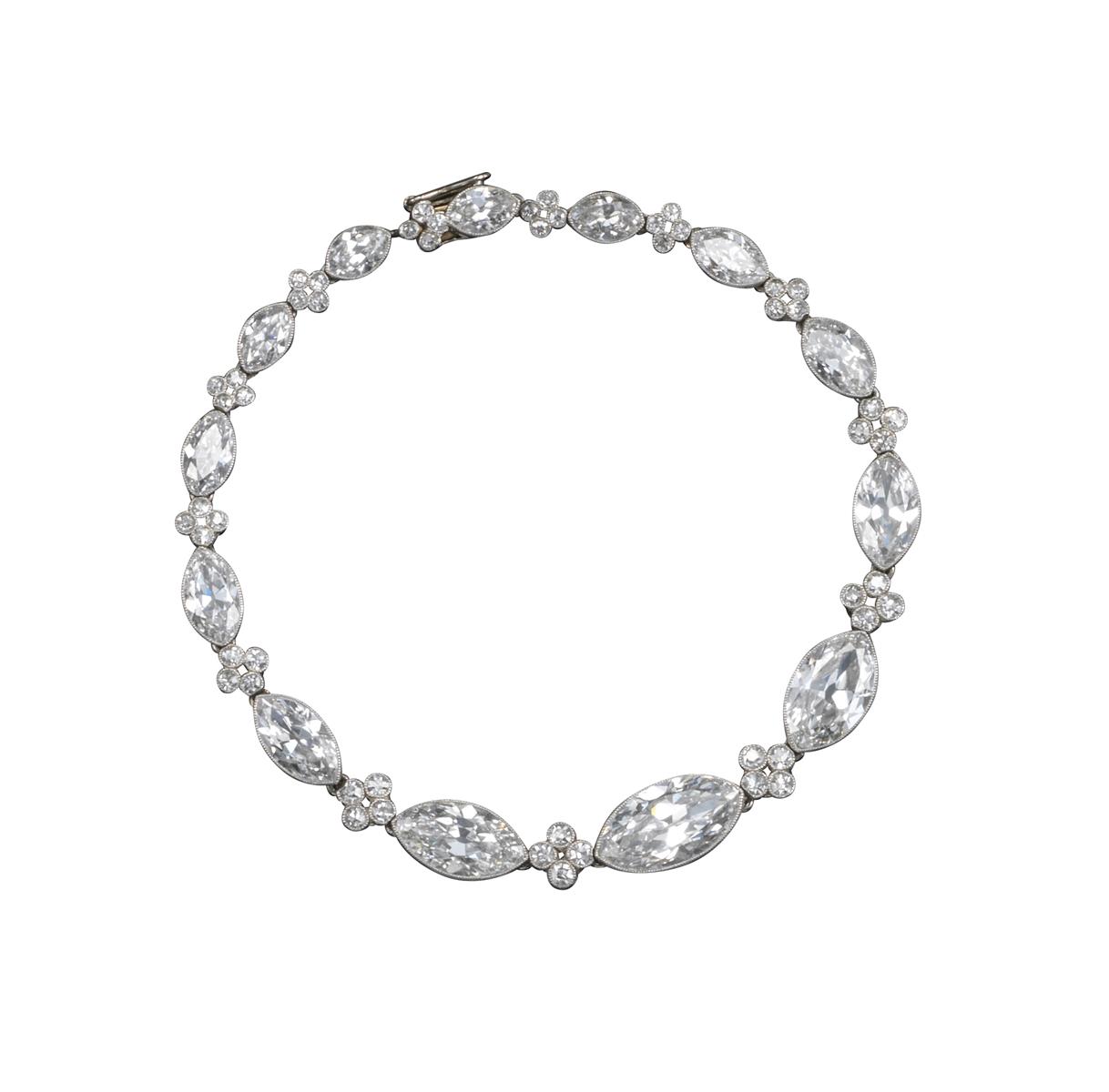 An early 20th-century diamond line bracelet, alternately-set with marquise-shaped diamonds and quatrefoils of diamonds millegrain-set in platinum, the largest diamond weighs approximately 2.05cts in total, total diamond weight approximately 9.30cts, 17.2cm long