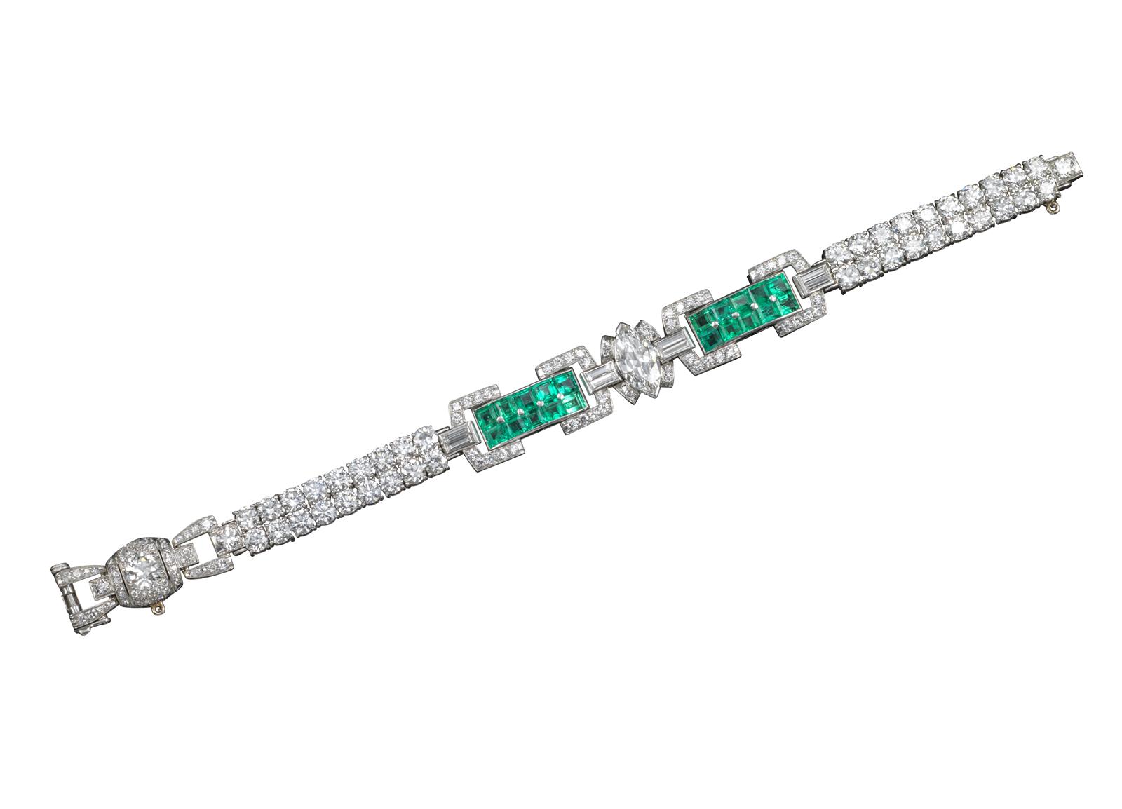 An emerald and diamond bracelet, of geometric design, set with a central marquise-shaped diamond weighing approximately 2.25cts, within abstract borders of circular-cut diamonds and square-shaped emeralds, on a further two rows of old circular-cut diamonds and a bombé-shaped clasp, pavé-set with diamonds and a central diamond weighing approximately 0.90cts, 19cm long, case