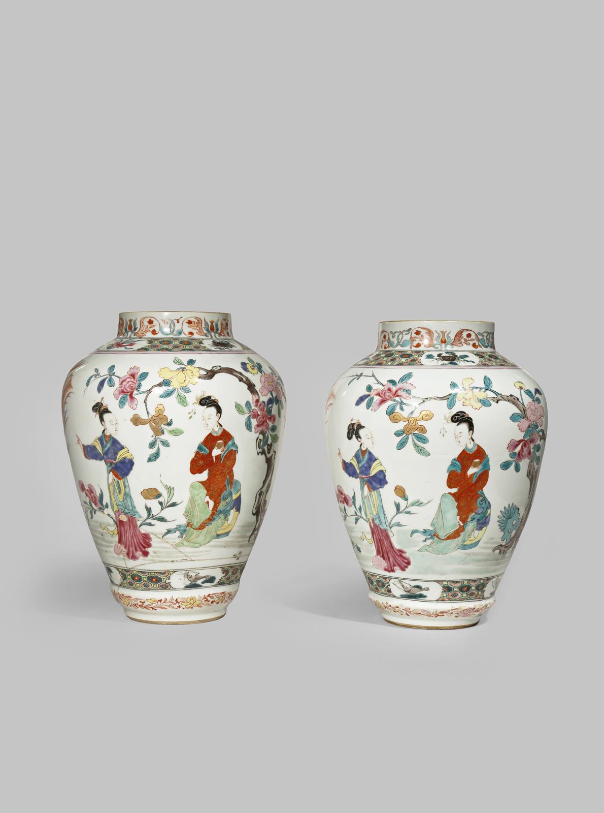 Each with an ovoid tapering body painted with colourful enamels and gilt, with three ladies by a blossoming tree gazing at two phoenix descending into their garden, with bands of shaped cartouches containing crabs, fish and crustacea against a diaper ground, and further floral bands to the shoulder and the foot, 34.5cm. (2)