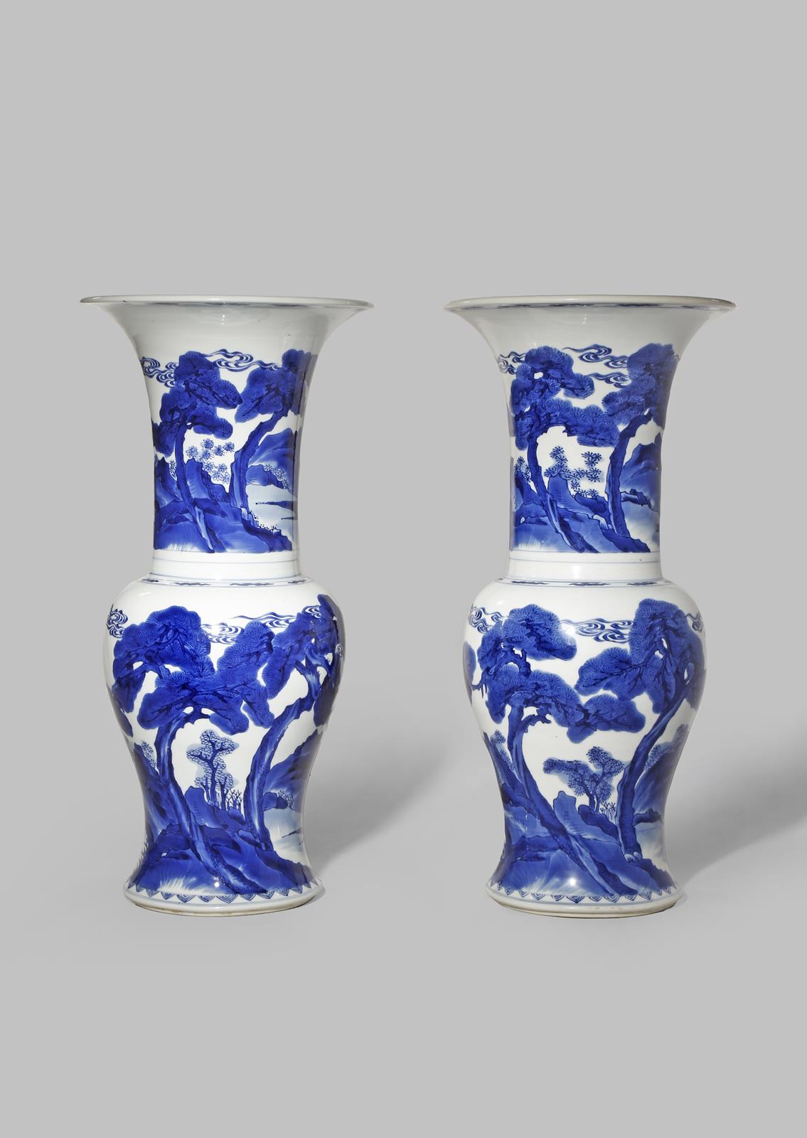 A PAIR OF CHINESE BLUE AND WHITE YEN YEN VASES KANGXI 1662-1722 Each painted in bright underglaze...