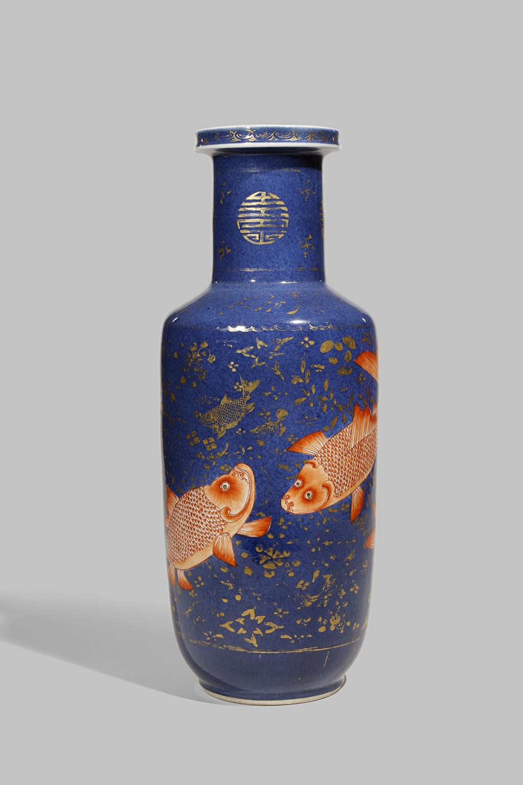 A CHINESE POWDER BLUE-GROUND ROULEAU 'CARP' VASE KANGXI 1662-1722 Decorated with four iron-red...