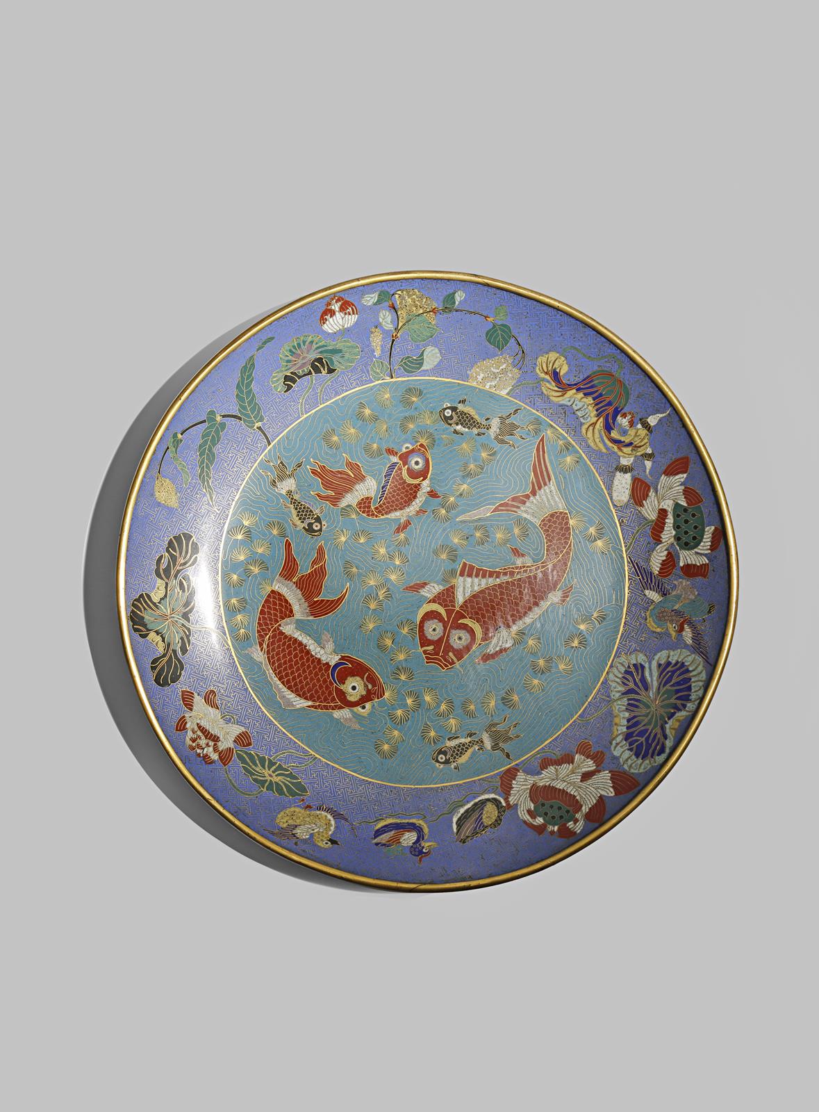 A MASSIVE CHINESE ENAMEL 'CARPS' DISH