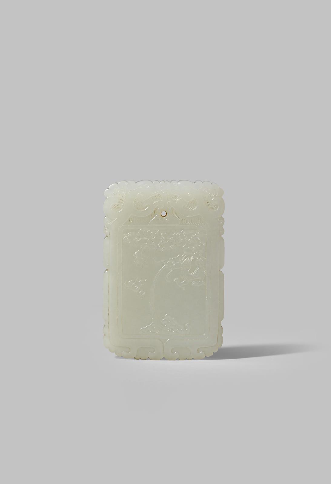 A CHINESE WHITE JADE RECTANGULAR 'DRAGON' PENDANT QING DYNASTY Carved in shallow relief on one...