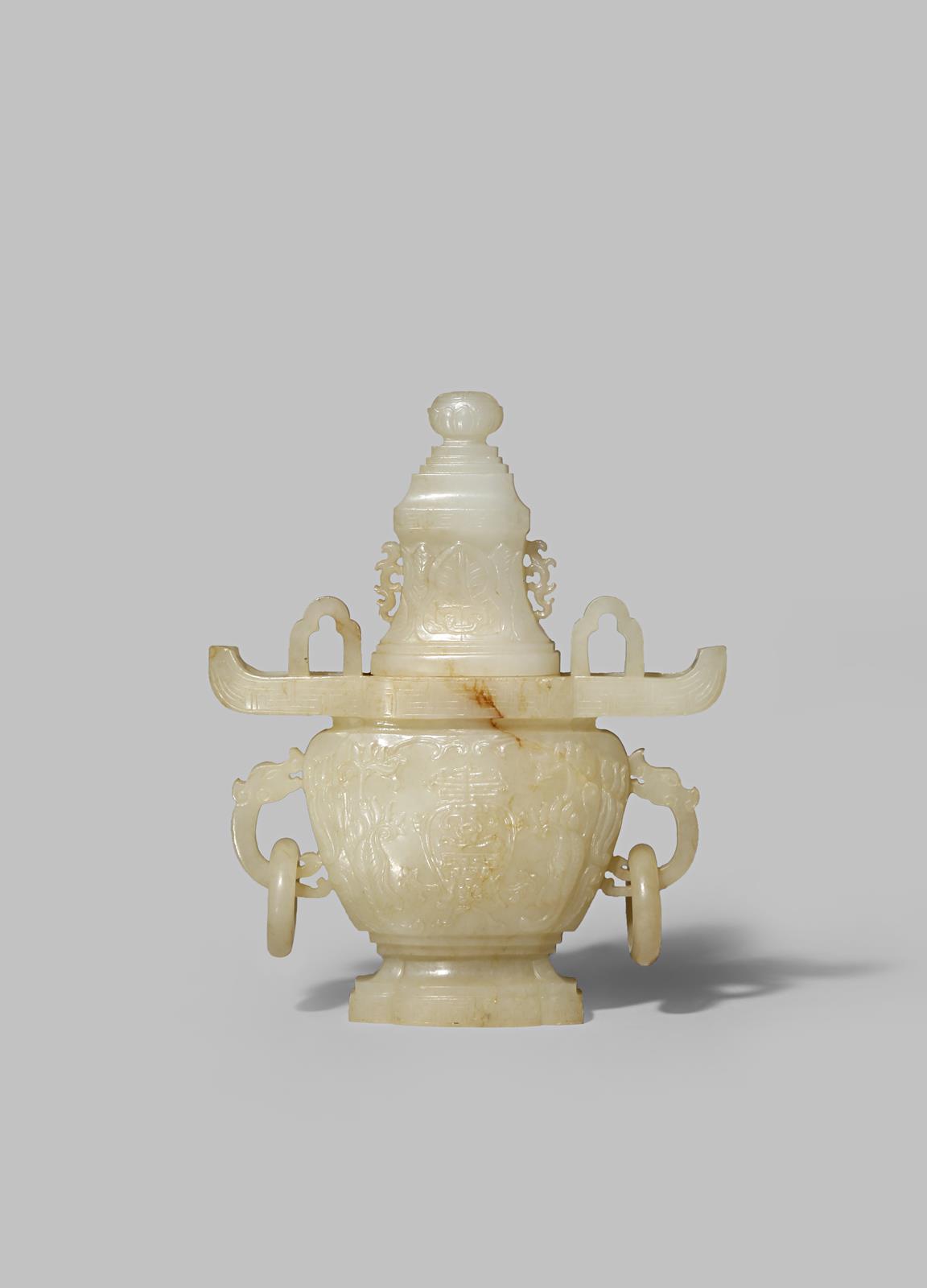 The flattened body decorated with shou characters and stylised floral designs and two dragon-shaped handles with loose rings, the rim with key fret borders and two loops for suspension, the cover with reticulated handles and a lappet border, the stone with russet markings, 13cm. (2)