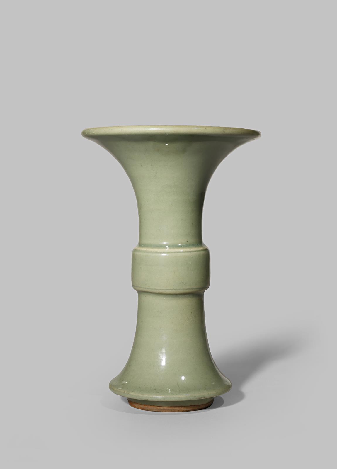 A CHINESE LONGQUAN CELADON GU-SHAPED VASE EARLY MING DYNASTY With a plain body and a tall flared...