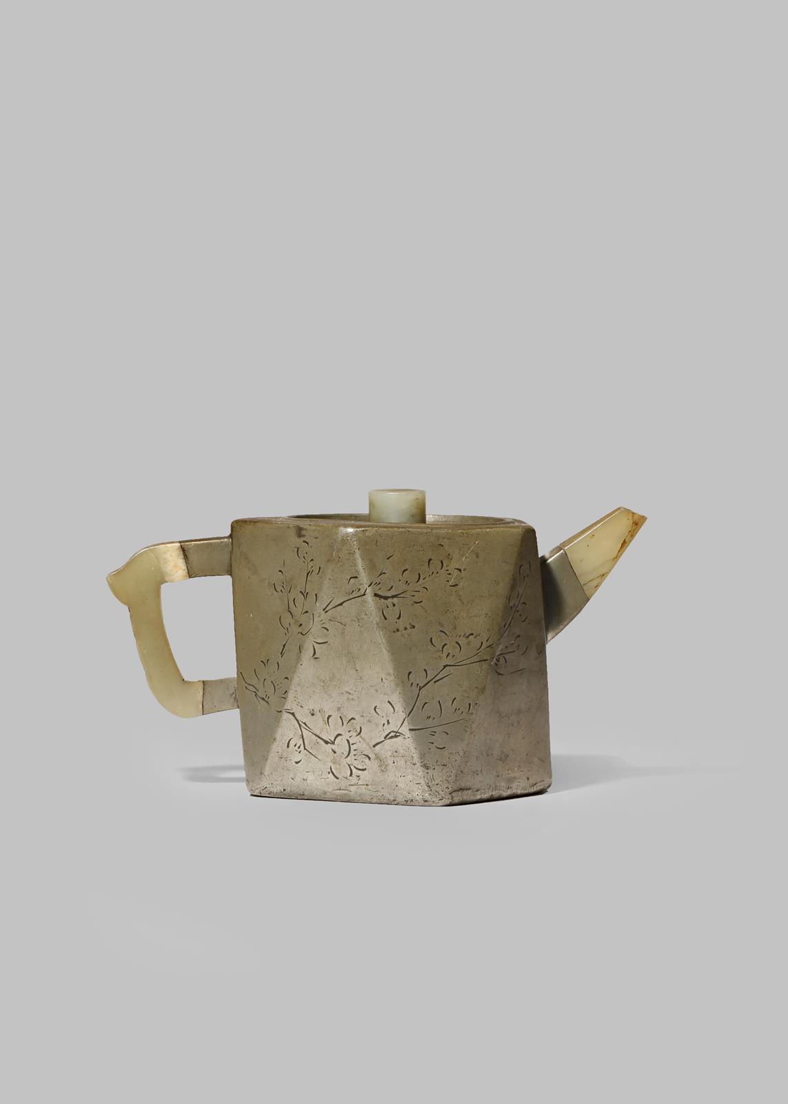 The pentagonal body set with a faceted jade spout, handle and knop, the ten triangular sides incised with blossoming prunus branches and poems about prunus blossom inscribed by You Zhu, a seal mark reading Shi De Tang to the interior, 15cm. (2)