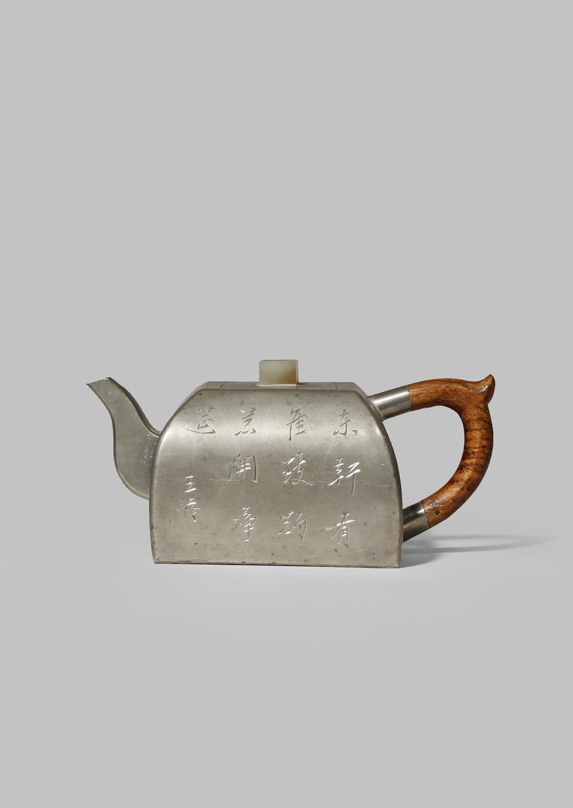 A CHINESE INSCRIBED PEWTER-ENCASED YIXING TEAPOT AND COVER QING DYNASTY The square-section body...