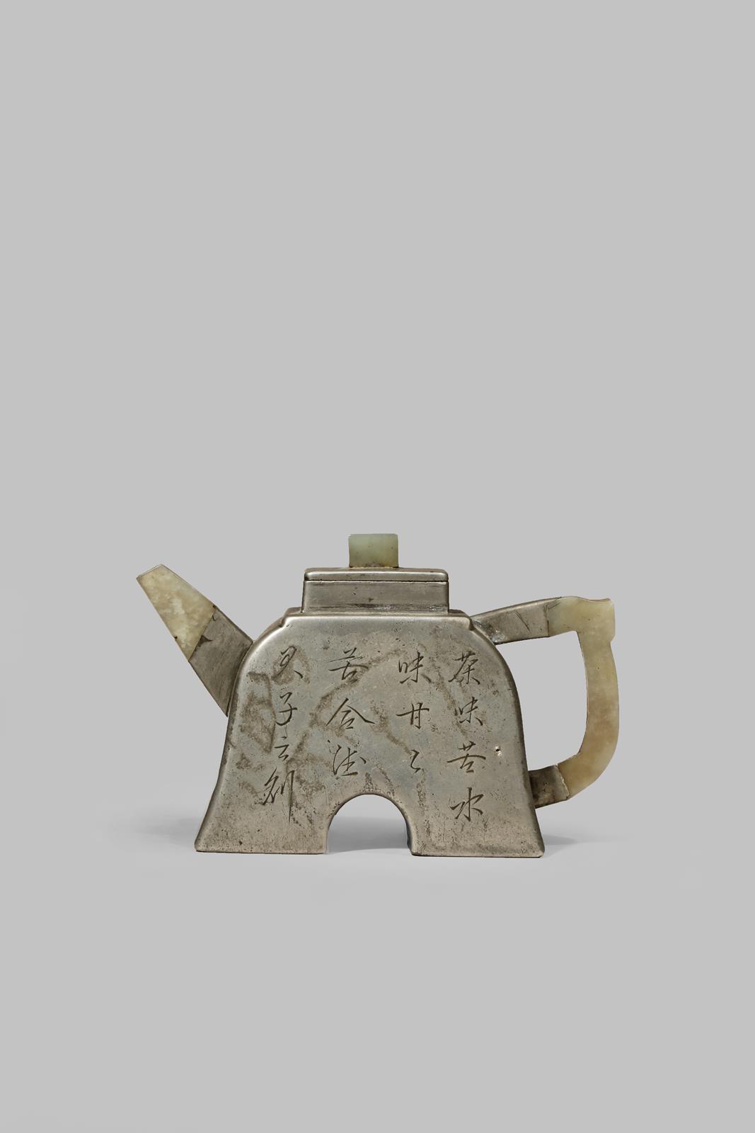 The coin-shaped body, set with an angular jade handle, the flat pewter cover with a square jade knop, one side incised with a spray of blossoming orchid, and a poem about tea drinking to the reverse, inscribed by Zi Yun, a seal mark reading Shi De Tang to the interior, 14cm. (2)