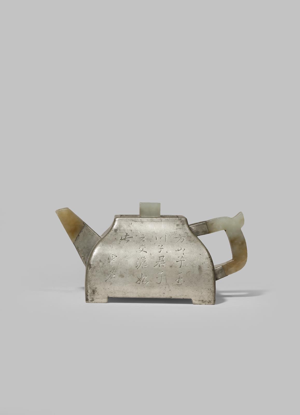 A CHINESE INSCRIBED PEWTER-ENCASED YIXING TEAPOT AND COVER QING DYNASTY The square-section body