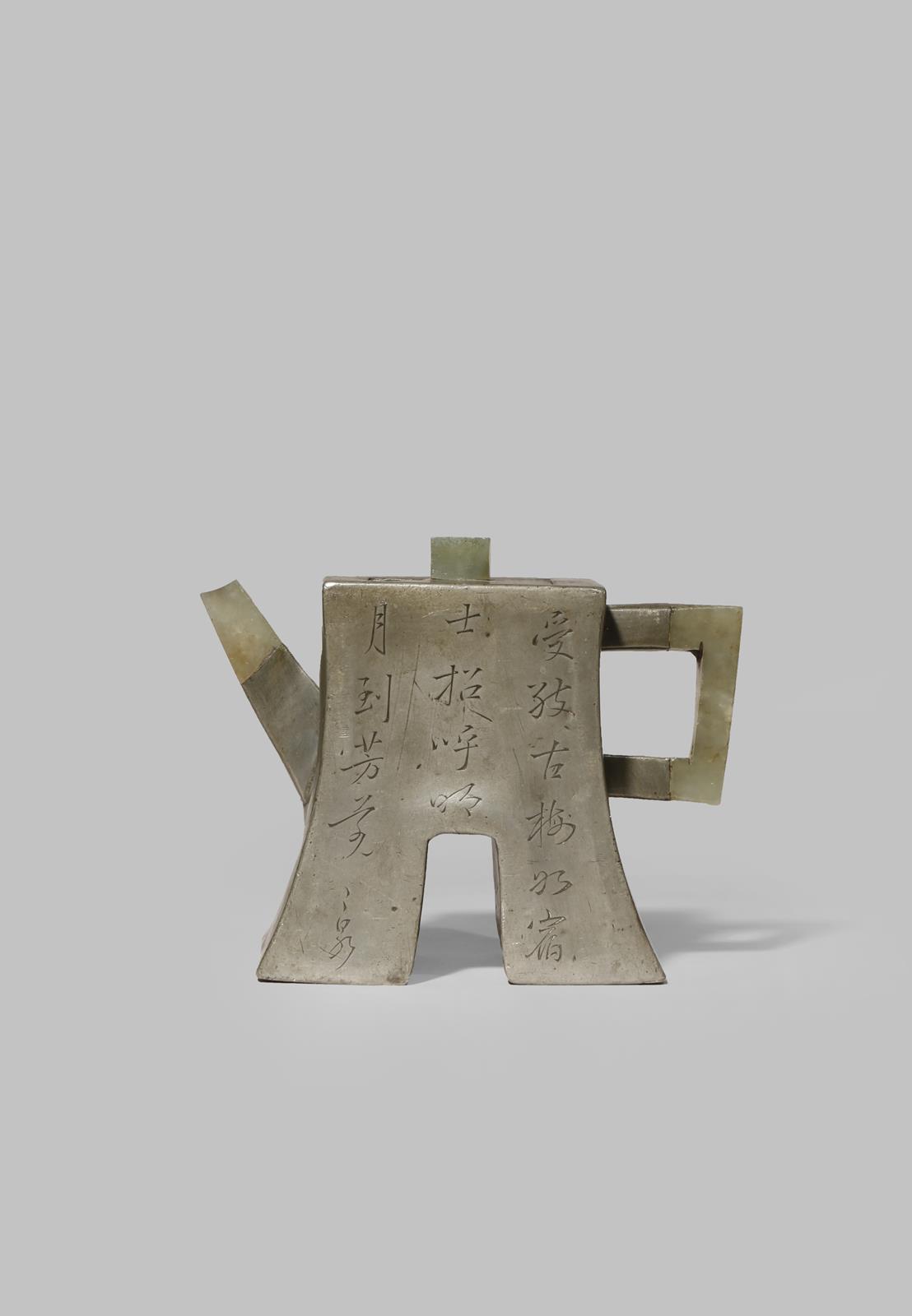 The coin-shaped body set with an angular C-shaped jade handle, a jade spout and knop, the sides incised with a blossoming prunus branch and a poem about prunus blossom and the moon, inscribed Er Quan, the interior with a seal mark which reads Fan Shu Zeng Zhi, 10.5cm. (2)