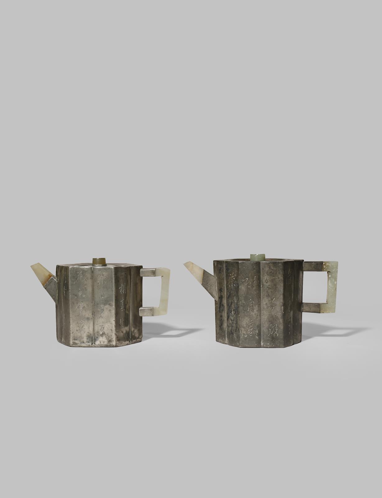TWO CHINESE HEXAGONAL PEWTER-ENCASED YIXING TEAPOTS AND COVERS QING DYNASTY Set with jade faceted...