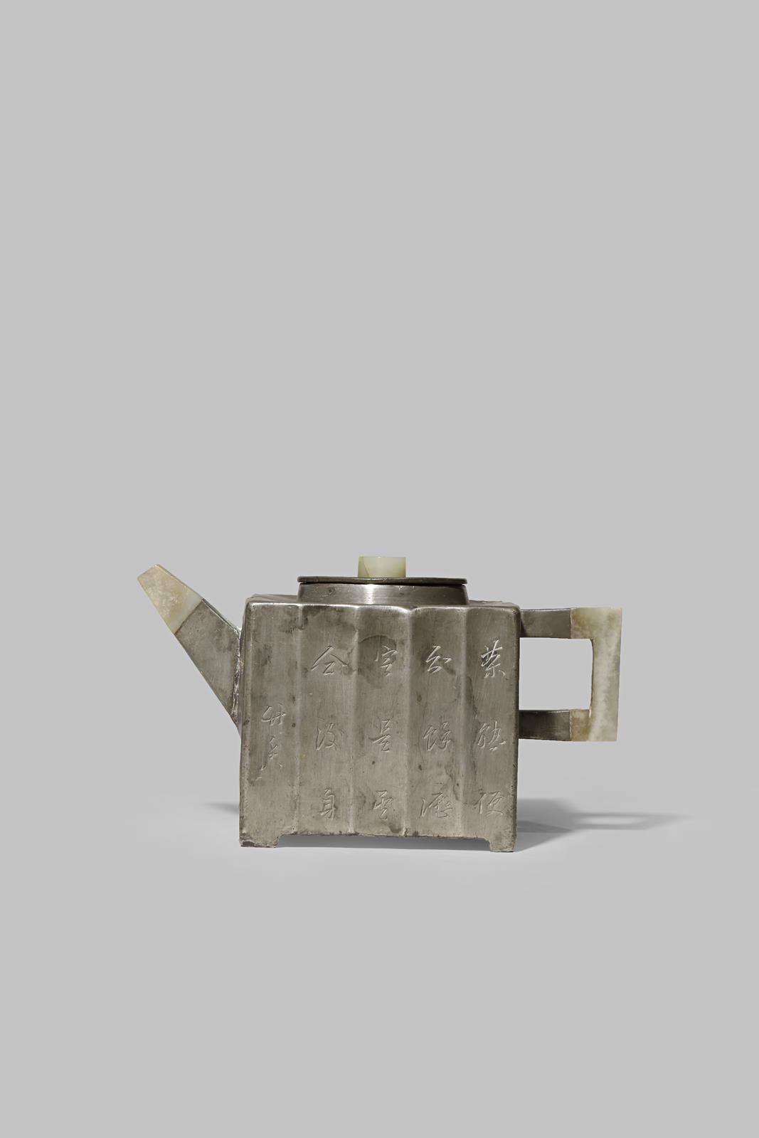 A CHINESE INSCRIBED PEWTER-ENCASED YIXING TEAPOT AND COVER QING DYNASTY Set with a faceted jade...