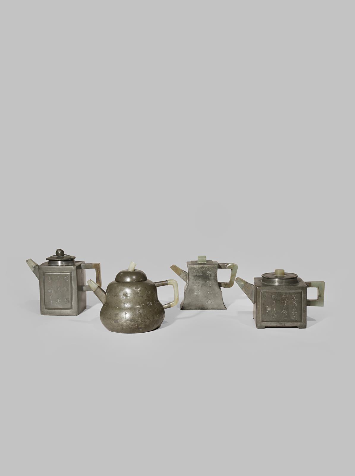 FOUR CHINESE INSCRIBED PEWTER AND PEWTER-ENCASED YIXING TEAPOTS AND COVERS QING DYNASTY Each set...