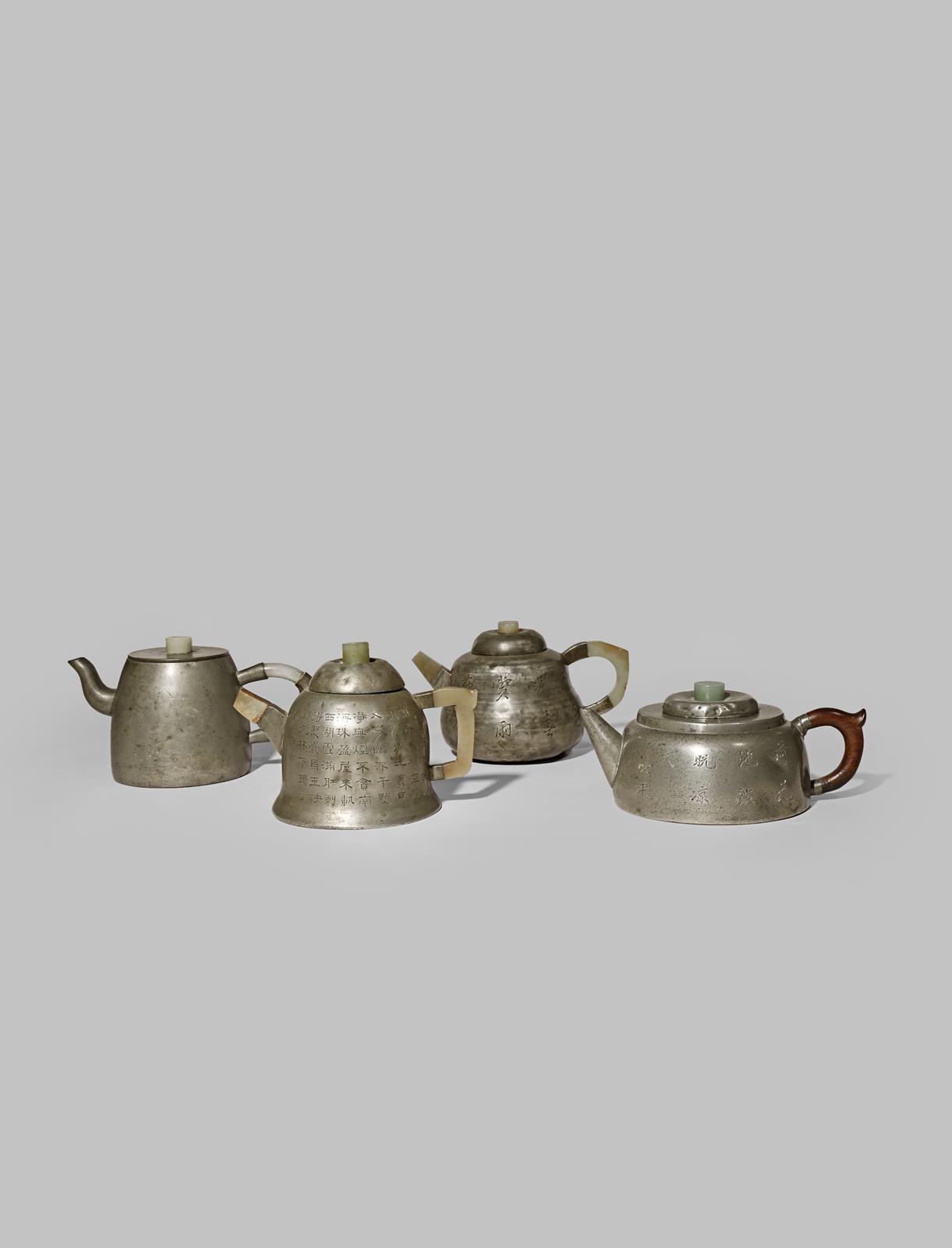 ONE CHINESE PEWTER AND THREE PEWTER-ENCASED YIXING TEAPOTS AND COVERS QING DYNASTY Three with...