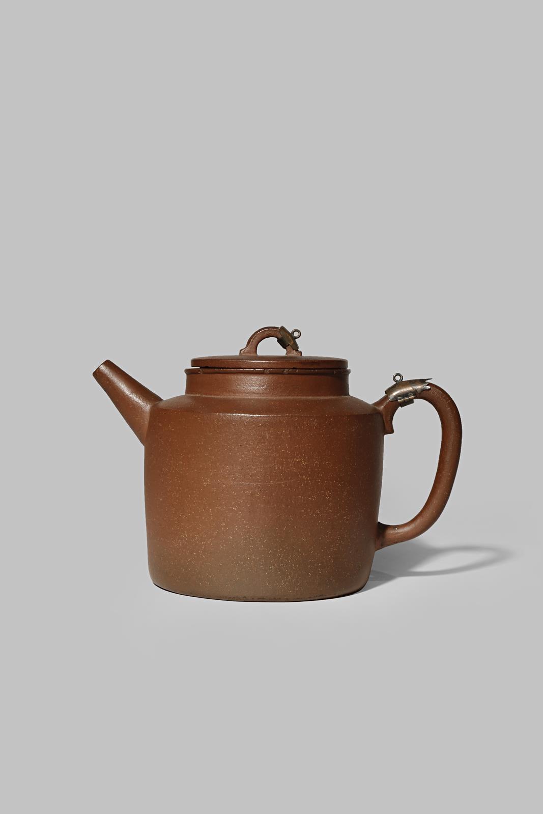 With a tall cylindrical body, a short spout and metal mounts to the handle and the associated cover, a five character mark to the base which reads Jing Xi Hui Meng Chen and an oval seal, 17.5cm. (2)