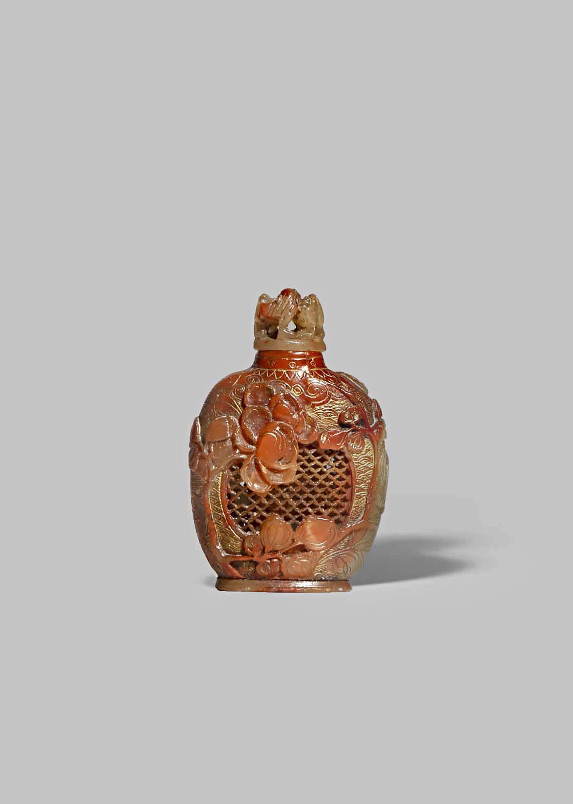 With a flattened ovoid body, carved with an intricate openwork cash design to one side and quatre-lobed panel to the reverse, with a spray of peonies in shallow relief against a dense wave pattern, with a band of ruyi-heads to the shoulder, the buff stone with red striations, 4.5cm.