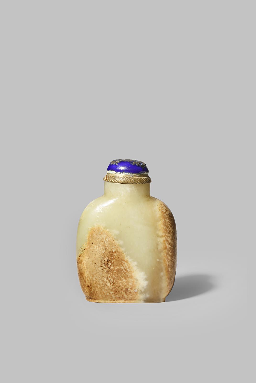 A CHINESE YELLOW JADE SNUFF BOTTLE 18TH/19TH CENTURY With a flattened ovoid body with natural...