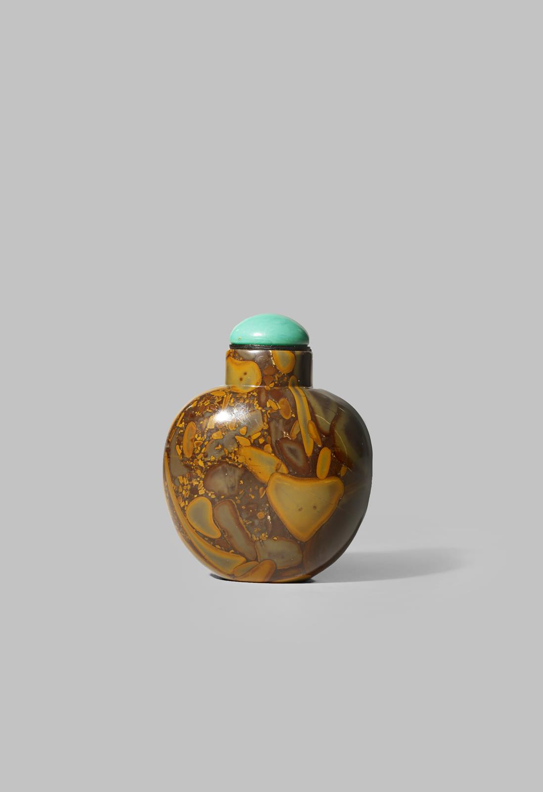 A CHINESE PUDDINGSTONE SNUFF BOTTLE 18TH/19TH CENTURY With a plain ovoid body and irregular...