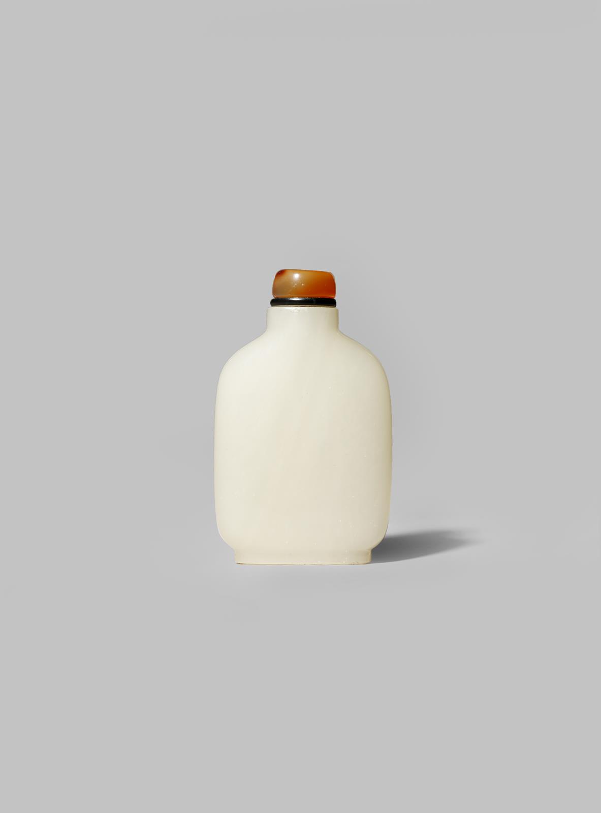 A CHINESE WHITE JADE SNUFF BOTTLE QING DYNASTY With a plain flattened body raised on an oval foot