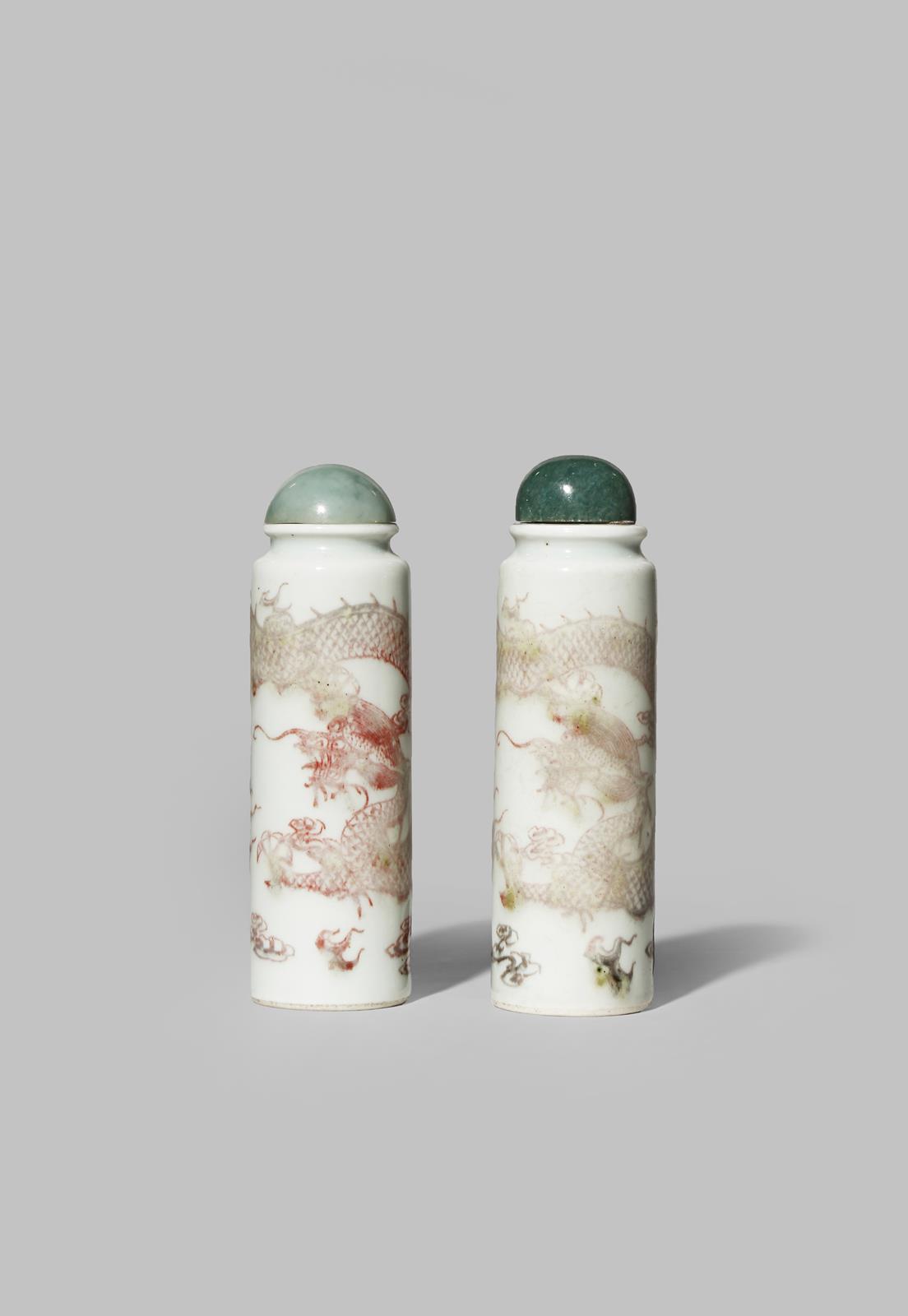 A PAIR OF LARGE CHINESE PORCELAIN UNDERGLAZE COPPER-RED 'DRAGON' SNUFF BOTTLES EARLY 19TH CENTURY...