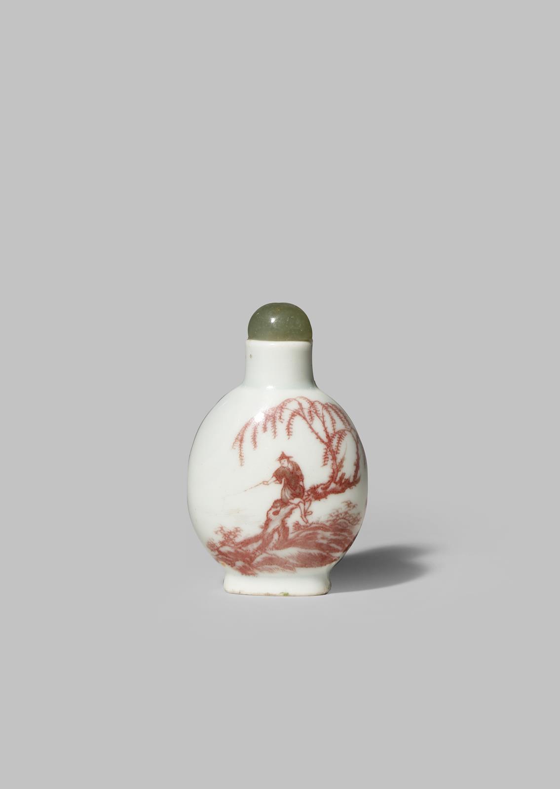 A CHINESE UNDERGLAZE COPPER-RED SNUFF BOTTLE 18TH/19TH CENTURY Painted with a fisherman seated...
