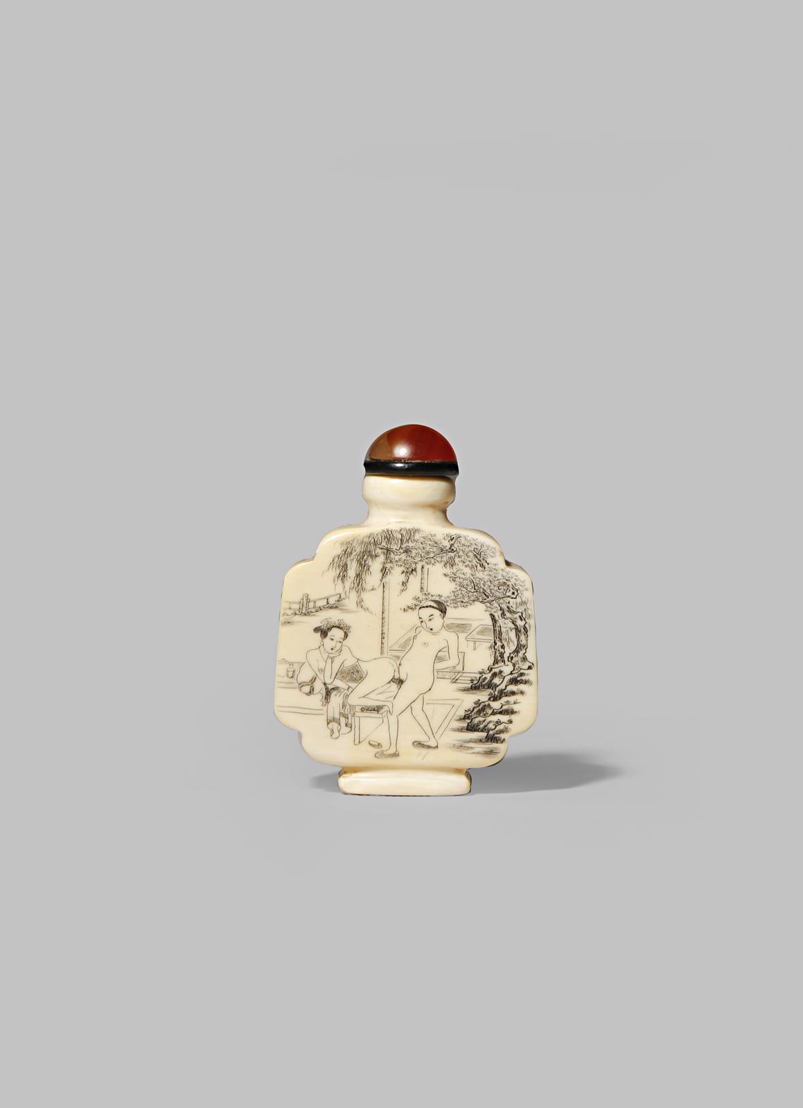A CHINESE IVORY EROTIC SNUFF BOTTLE 19TH/EARLY 20TH CENTURY With quatre-lobed body engraved to...