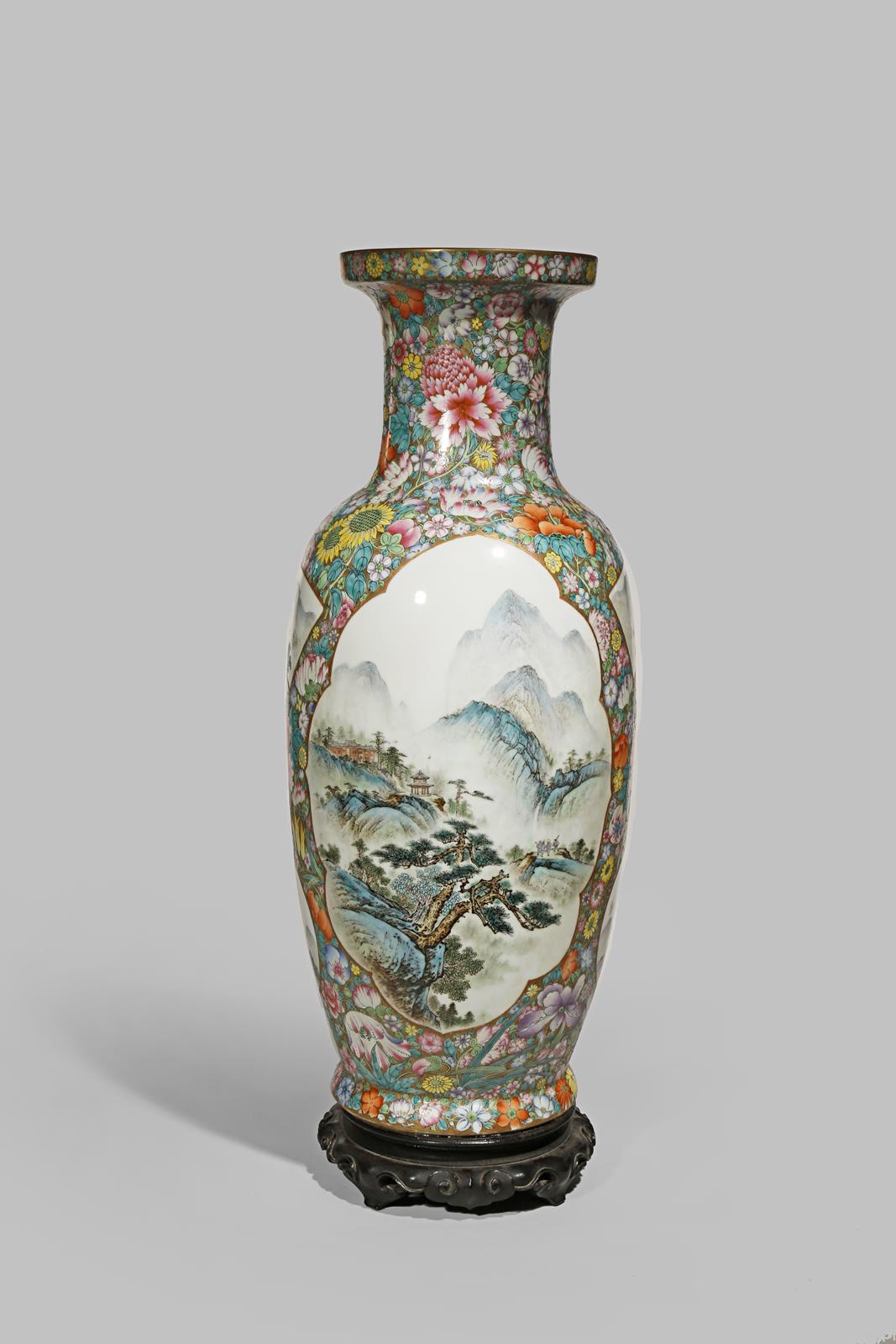 Decorated in bright enamels with panels containing mountainous landscapes on a rich millefleurs ground, the wood stand attached, 61cm.