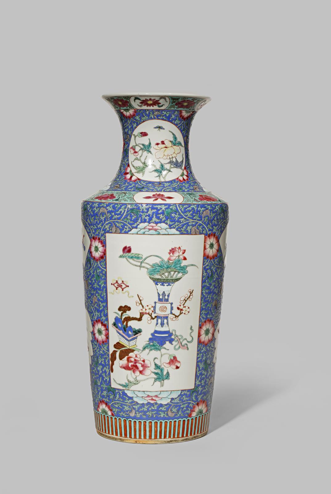Decorated with shaped panels containing precious objects and blossoms against a blue ground with scrolling lotus leaves and flowerheads, 42cm.