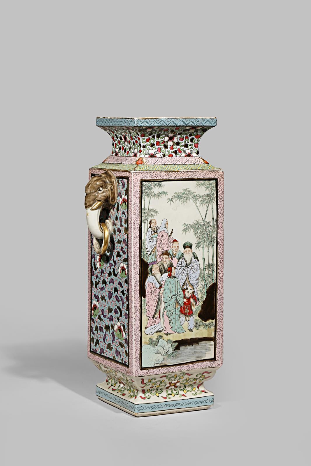 A CHINESE FAMILLE ROSE SQUARE-SECTION VASE 19TH CENTURY The body painted with two panels...