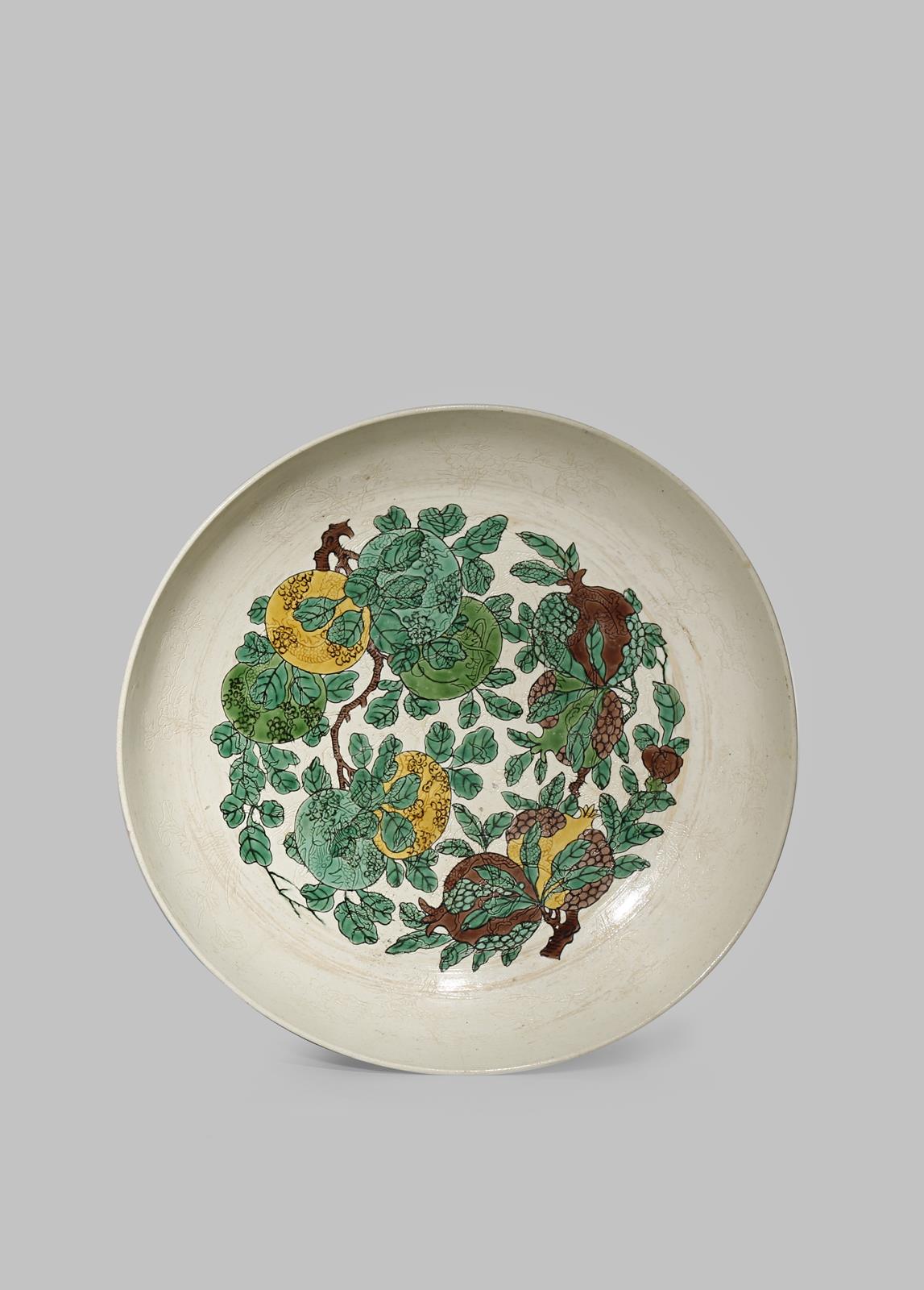 A LARGE CHINESE SU-SANCAI DISH QING DYNASTY The biscuit body painted with pomegranates and other...