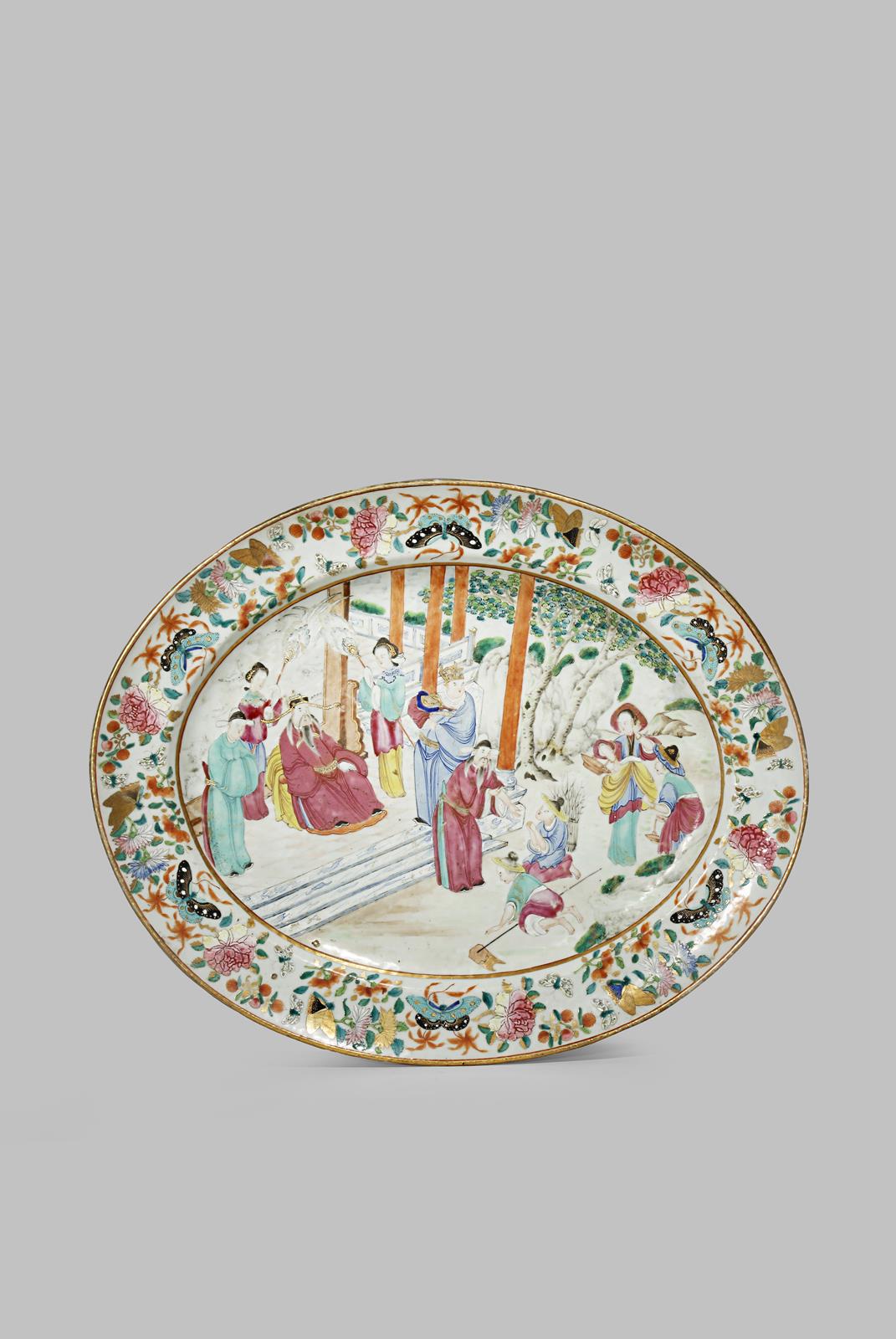 A CHINESE CANTON FAMILLE ROSE OVAL DISH 19TH CENTURY Decorated with a scene of peasants...