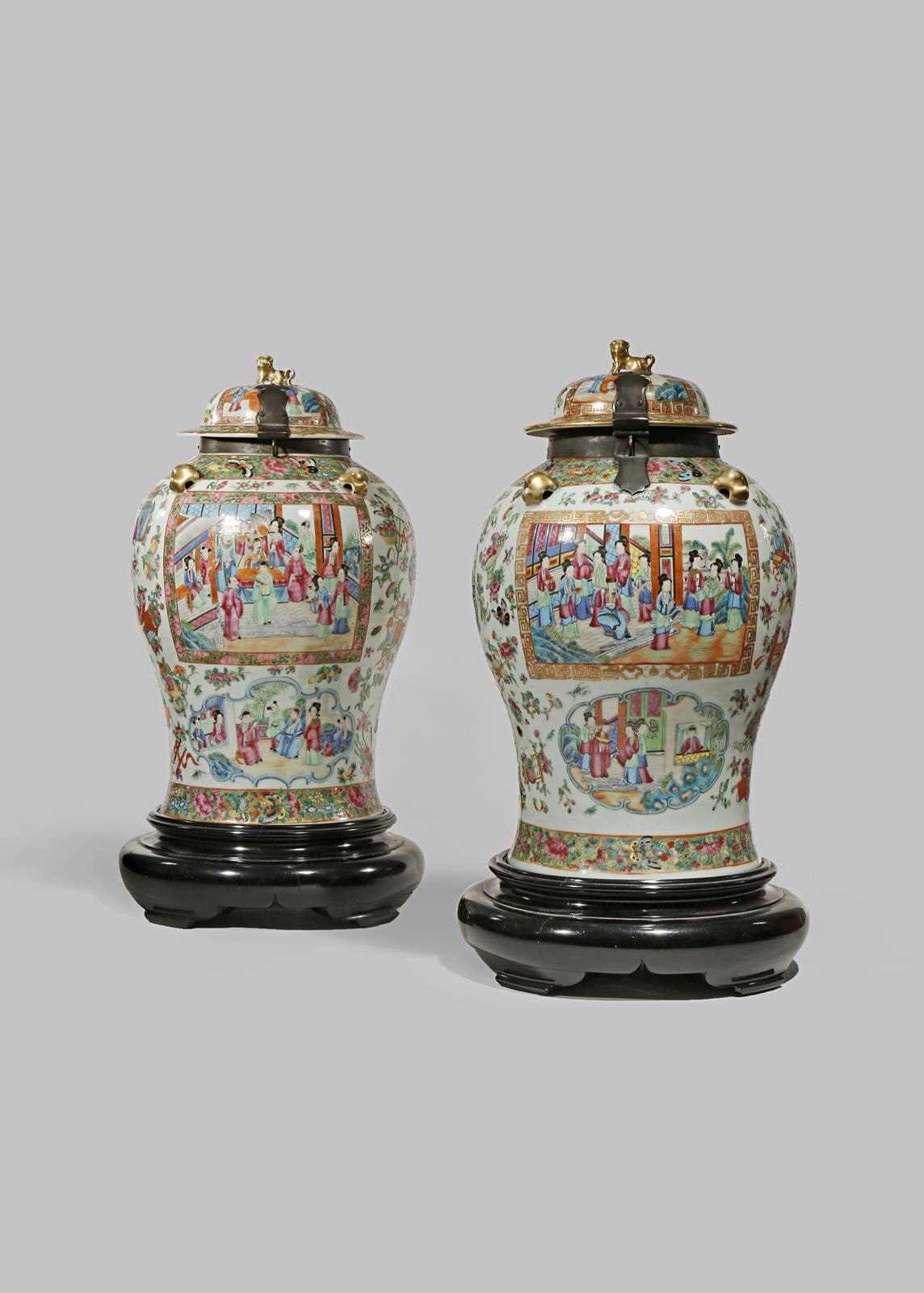 A NEAR PAIR OF CHINESE CANTON FAMILLE ROSE VASES AND COVERS