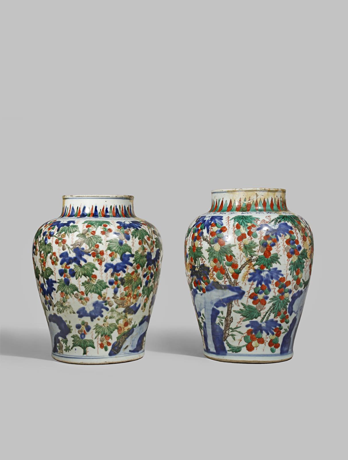 A NEAR PAIR OF CHINESE WUCAI VASES MID 17TH CENTURY Brightly painted with fruiting vines in red
