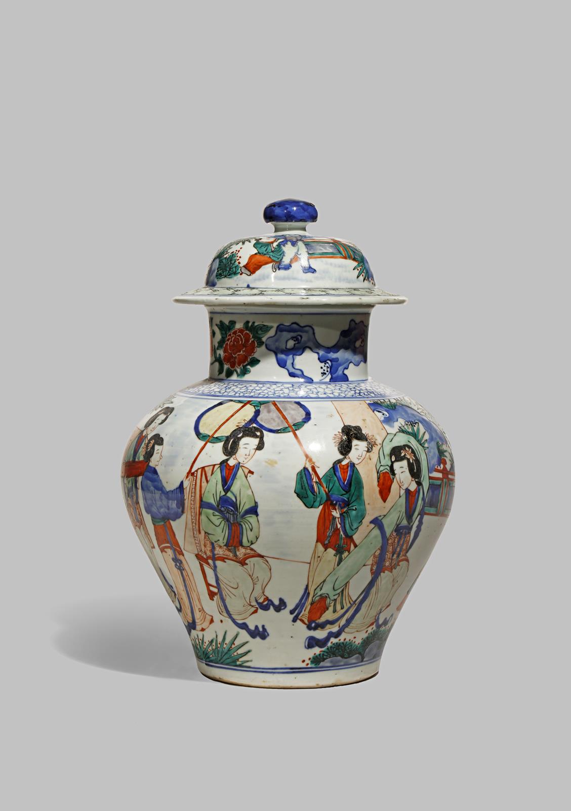 A CHINESE WUCAI VASE AND COVER 19TH CENTURY The ovoid body painted with a lady and attendants in...