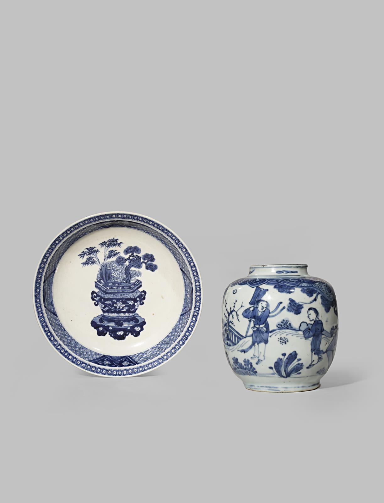 Decorated with three figures in a garden, together with a blue and white soft-paste shallow bowl decorated with a jardinière, the base with a six character Chenghua mark, 20cm. (2)