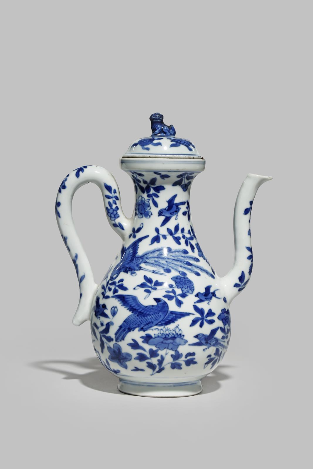 A CHINESE BLUE AND WHITE EWER WITH AN ASSOCIATED COVER KANGXI 1662-1722 The pear-shaped body...