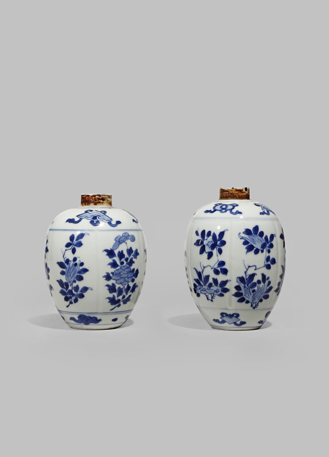 A PAIR OF CHINESE BLUE AND WHITE OVOID JARS KANGXI 1662-1722 Decorated with floral sprays and...