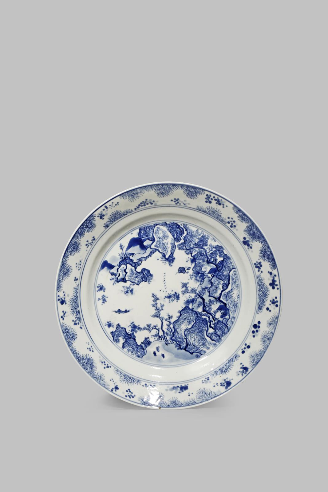A CHINESE BLUE AND WHITE 'MASTER OF THE ROCKS' PLATE
