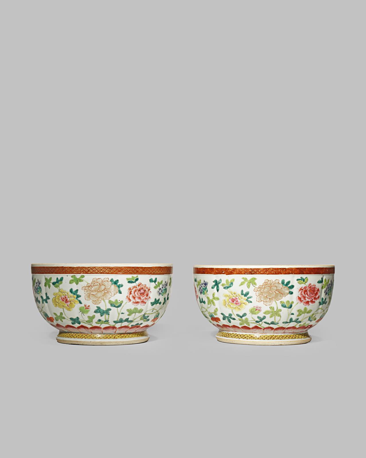 A PAIR OF CHINESE FAMILLE ROSE MOULDED BOWLS