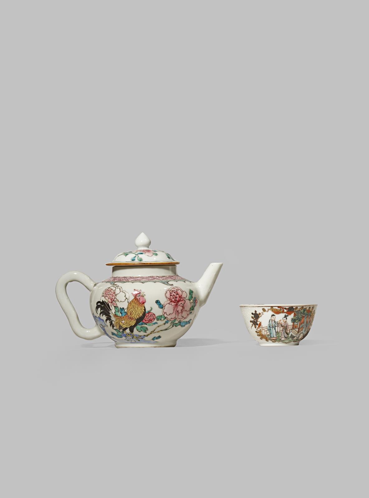 A CHINESE FAMILLE ROSE TEAPOT AND A COVER AND A TEA BOWL YONGZHENG 1723-35 The teapot painted on...