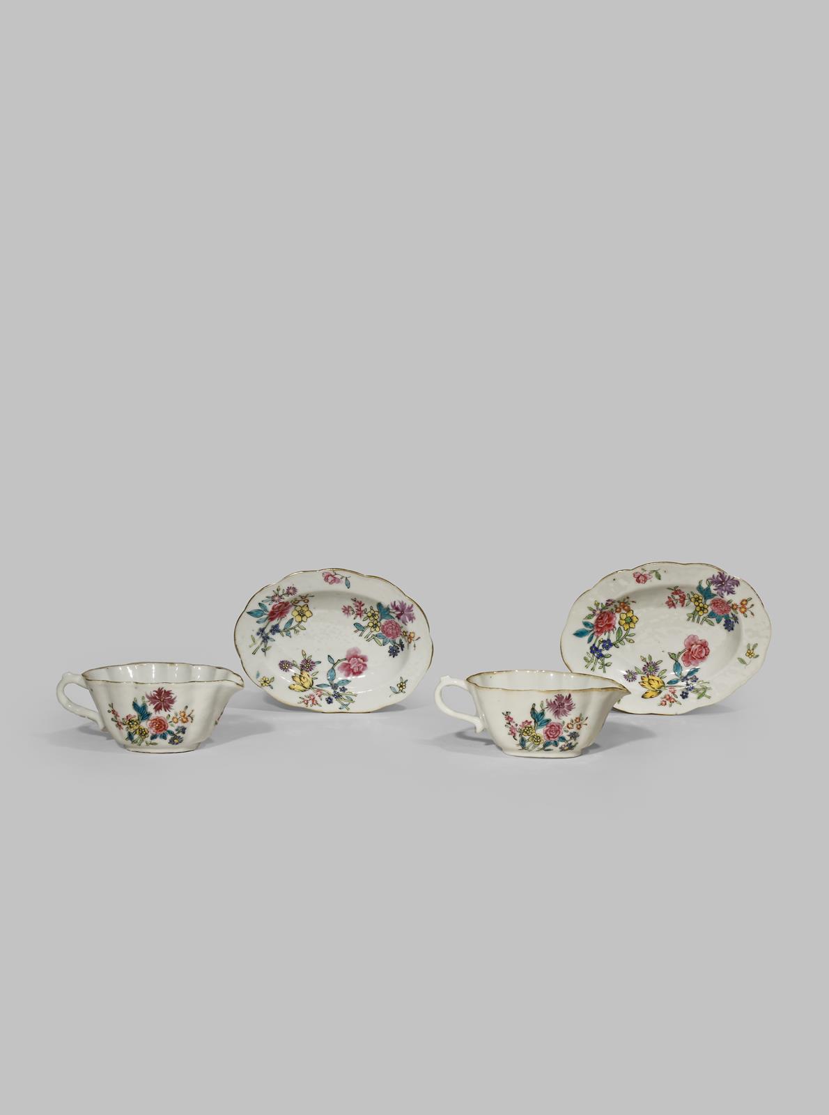 A PAIR OF CHINESE FAMILLE ROSE MINIATURE SAUCE BOATS AND STANDS 18TH CENTURY The lobed bodies...