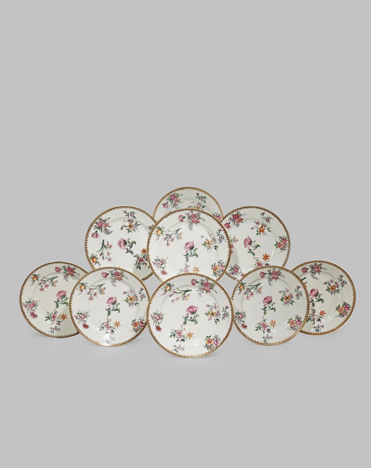NINE CHINESE FAMILLE ROSE PLATES MID 18TH CENTURY Each painted with flower sprays and fruit...