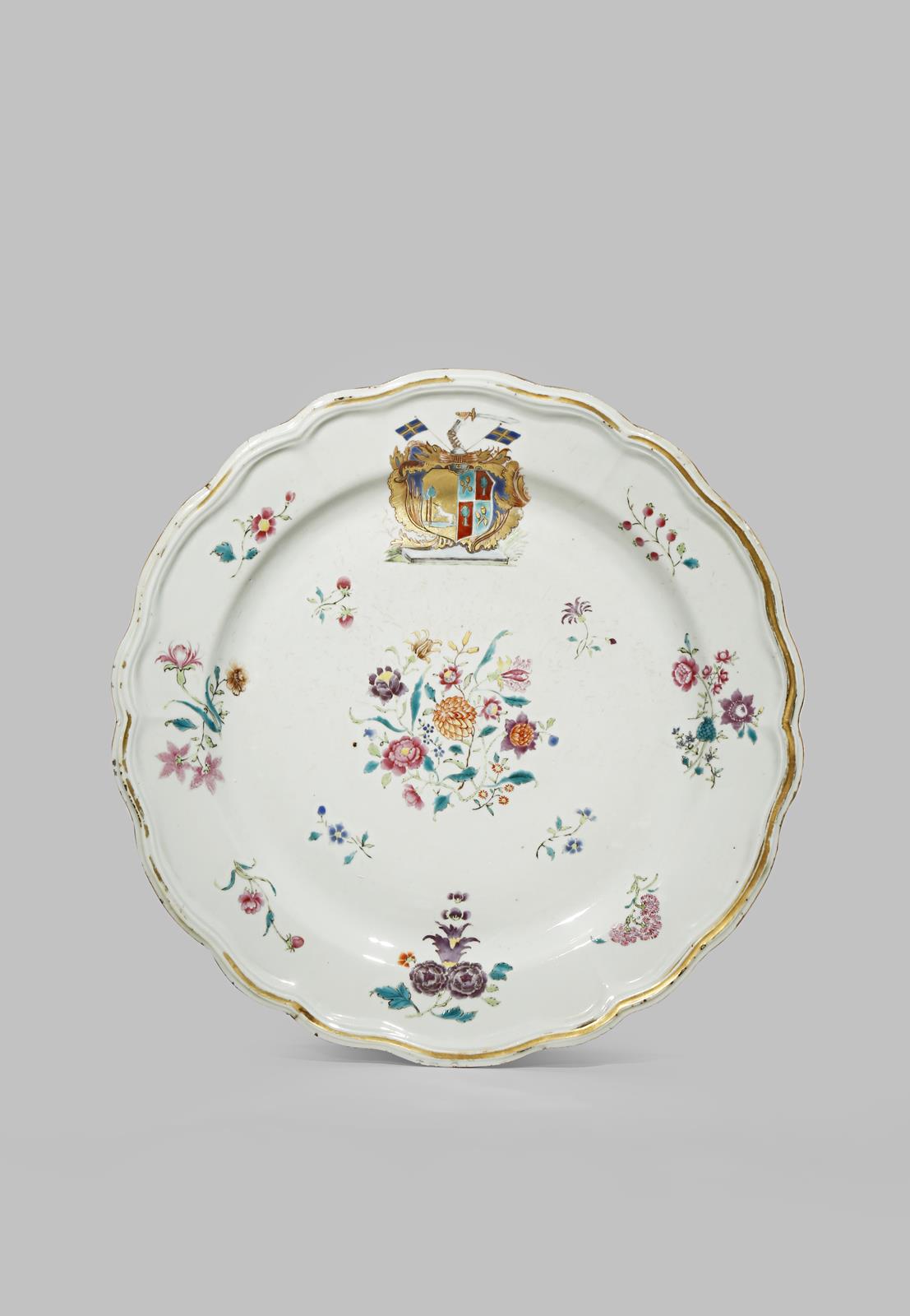 A LARGE CHINESE FAMILLE ROSE ARMORIAL PLATE FIRST HALF 18TH CENTURY Decorated with a rare...