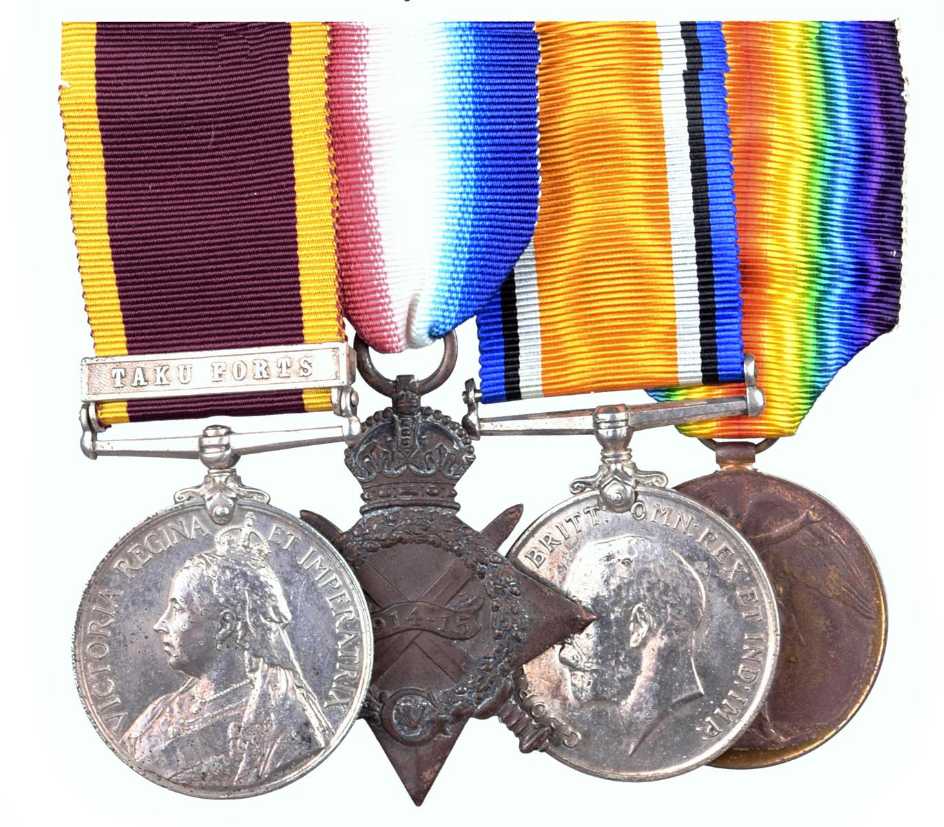 Four Medals to Able Seaman E.G. Bartlett, Royal Navy: China 1900, clasp: Taku Forts (E.C. BARTLETT, A.B., H.M.S. ENDYMION.); 1914-15 Star, British War and Victory Medals (163394, E.C. BARTLETT A.B. R.N.), later mounted with some later ribbons.